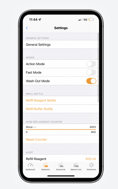- Akční režim v Alkatronic umožňuje nastavit a zapomenout na funkci ovládání. Tuto funkci lze spojit s Dosetronicem, aby se prvky dávkovaly/vynechávaly vyváženým způsobem.