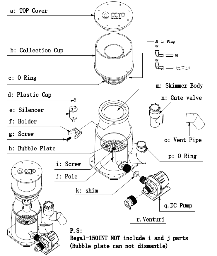 - OCTO series Regal internal protein skimmer (Regal-INT) is an in-sump protein skimmer featuring high-quality cast acrylic body construction, easy disassembly for maintenance, a precision control gate valve and a hybrid conical body which helps to naturally stabilise and concentrate the organic rich foam as it rises.
