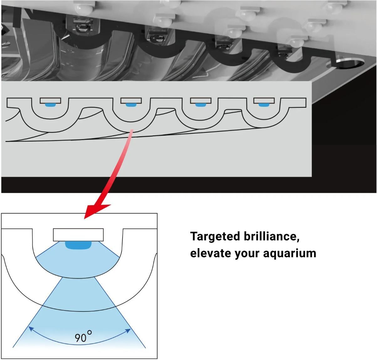 S 276 LED čipy s maximálním teoretickým výkonem 726 W využívá z tohoto obrovského množství redundantních LED čipů pouze 150W , což umožňuje plynulé přechody mezi plně modrým a plně bílým spektrem a poskytuje bezkonkurenční kontrolu nad světelným prostředím akvária.